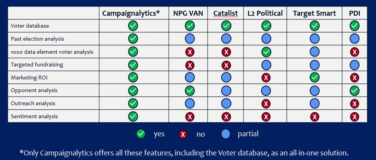Campaignalytics stands out in the political data and analytics space by offering unique, advanced tools that cater to campaigns of all sizes. When compared to industry giants like NGP VAN, Cata list, and TargetSmart, Campaignalytics excels in several key areas.